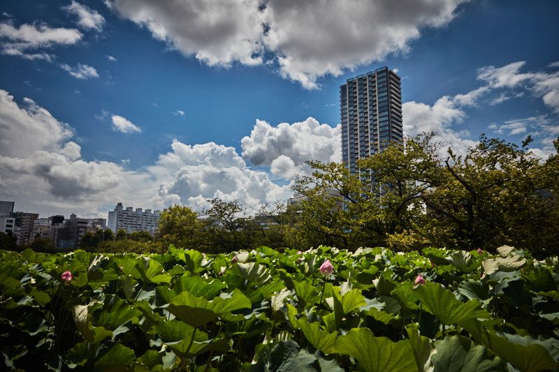 Which is how I found myself walking past Ueno park. This seems to be a bit of a theme by now: go somewhere, find a sign for something interesting, follow those signs, get lost. Yesterday that meant walking around Yoyogi park, trying to walk north to south, and then being really confused how I ended up at the northern tip again. Today though it seemed to be less lost than confused. The maps kept on saying that there was supposed to be a big puddle of water coming up, and the closer I get, the more skeptical I got. Because all I could see in the distance was this giant lake of lilly pads ...