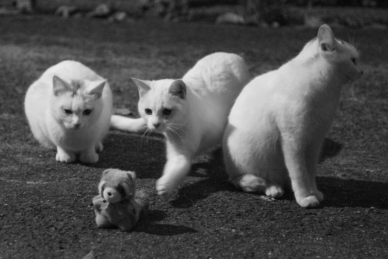 On the way down, we ran into three white cats. We kept on hoping that they would huddle close enough to get all three in the picture, but to no avail. Eventually Washinoko decided he needed a picture with one of the cats, at which point he got swarmed. The thought of whether I see Washinoko again crossed my mind as he was prodded and sniffed. But in the end we got all the cute fluff balls together.