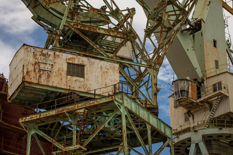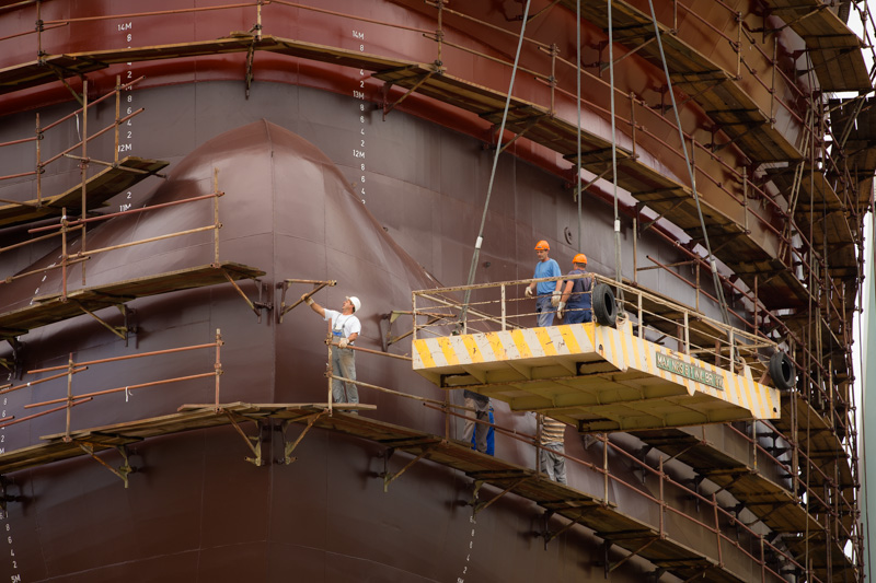 At some point in all this, we came across a dry dock, with a fairly large cargo ship being built. The nose looked painted and sea worthy while the back looked like a rust bucket. But since the nose was done, they started removing some of the construction platforms from there. This was attached to the boat, wooden planks to walk on, metal guard rails at two heights to stop you from falling off. To remove this, they had a small platform hanging from a crane that they put everything on. Only downside is that it's a little clumsy to take everything off the boat while standing on this platform, so they had one person slowly unscrewing the platforms he was standing on and handing the various planks to the mobile platform. And after a while, he also left the mobile platform behind and was still unscrewing...