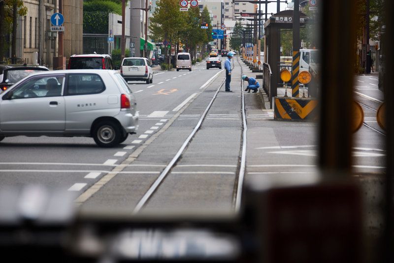 Most of Japanese rail shuts down at night to provide an open maintenance window. This is not a concern for Okayama who just works while the rail is operating. When I saw the truck and people obviously welding on the rail ahead of us, I assumed they must have closed the rail and I just didn't realize with my lack of Japanese. Right until we approached and they quickly got out of the way (adding some final adjustments with a hammer seconds before we went over).