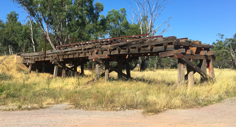 Other random things include: trees with about 20 shoes slung on the branches; found two of those. A kookaburra standing on the road, playing chicken, and actually winning; I thought he'd flinch when I roared past him by 20cm but he was still standing there in my rear view mirror. And a large watering system on wheels, that, when seen from a few kilometres and through hot refracting air, looked like something was wrong with the clouds on the horizon. And a train track bridge where the bridge was taken down by dumping the tracks and wood onto each end of the remains.