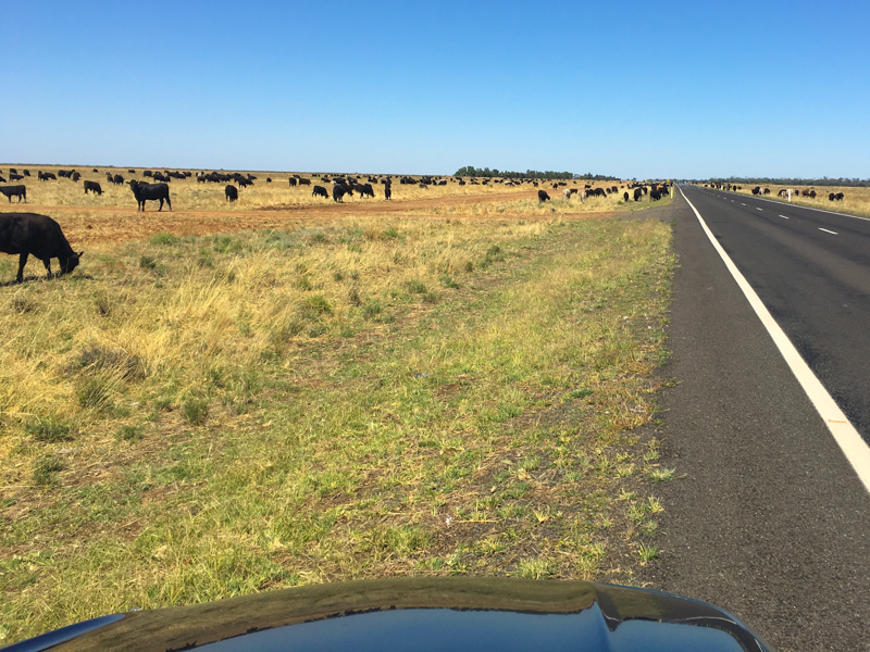 Finding cows is not exactly original in Australia, but usually they still restrict themselves to staring at you over the fence, or (on rare occasion) being scuttled over the road. In this case, the fences kept them in the area of the road as opposed to away from it. Though you tend not to find them standing on the road, probably because the yummy grass doesn't grow there.