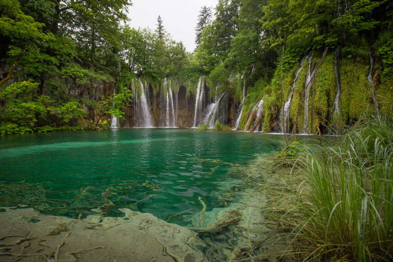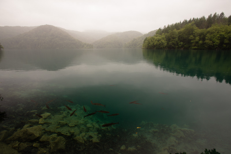 After being run into by enough tourists, on the narrow board walks with only the river to catch you if you fall, we found a small hiking trail to take us back the long way. Since it had been raining the entire morning up to now, this made for some fun sliding in the dirt, a few puddles gathering in the shoes, and the only way to stay warm was to keep moving. But we did get some fun grass meadows, foggy mysterious forests, and occasional outlooks to the tiny tourists below. Fun, but my feet ended up as ice blocks, and my legs hurt now. But hey, we walked like twice as much as we had walked on any previous day.