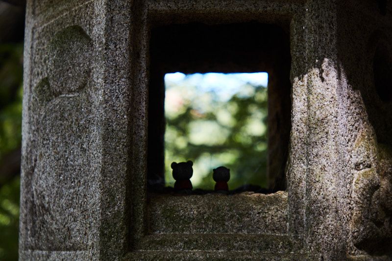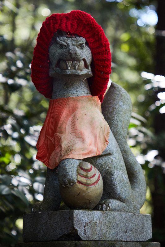 Lies! On both accounts. In terms of rough sections, the roughest part was when they put boards above the walk to presumably cover up whatever roughness was underneath, but they weren't anchored very well so they wobbled a bit. And those refreshing wonderful views were ... well I think that sign may have been written when all the trees were a little bit shorter and not completely blocking the view outward yet. But they did have a little praying temple being guarded by the firecest of ... cute cuddly statues with knited hats? Okay, I guess even guardian statues have mothers, and those mothers have probably heard how cold it can get up on the hill. Why they're not allowed to take them off in the swealtering heat of summer though ...