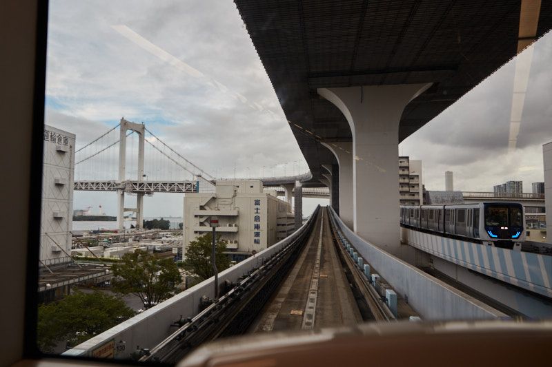 I always laughs slightly about the fact that the Yurikamome Line (新交通ゆりかもめ) is also commonly referred to as a monorail, even though it rides on rubber tires that are quite obviously placed like that of a normal train. The "rail" part is merely a guide, that alternates sides based on what is more convinient / which way the switch goes. But it is very proudly Tokyo's first fully automated train system, which is not bad for a train system opened in 1995.